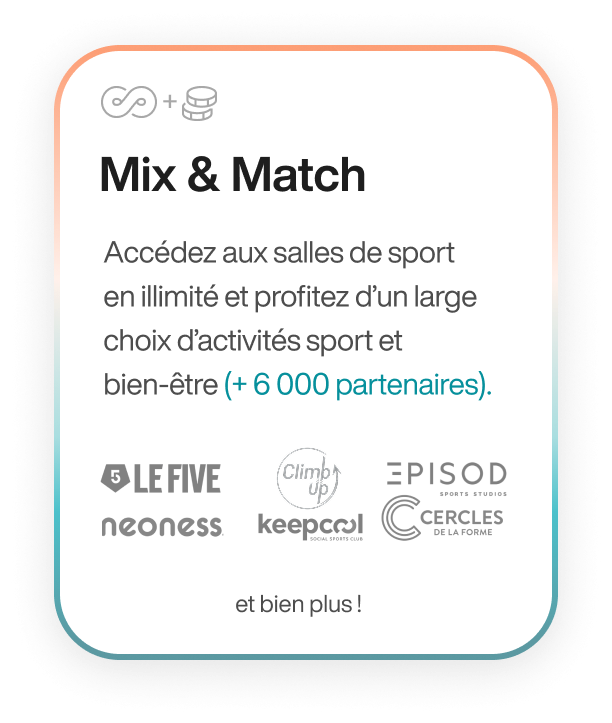 Un abonnement unique pour accéder à 6 000 salles et 300 activités sport & bien-être. Sans engagement, simple à mettre en place, cofinancé par l'entreprise.