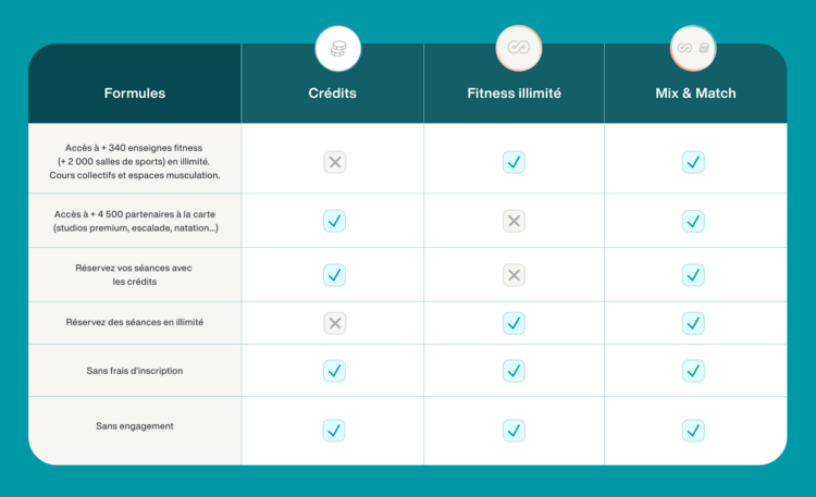 - Les formules Crédits pour réserver des disciplines à la carte : escalade, boxe, Pilates, natation, yoga, cycling...